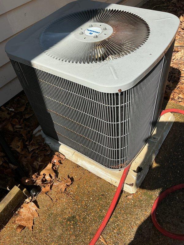 Performed scheduled cooling system maintenance on 25-year-old outdoor condensing unit. Inspected condenser coils, fan assembly, and electrical components. System functioning within normal parameters; recommended continued preventative maintenance to extend equipment life despite age of system.